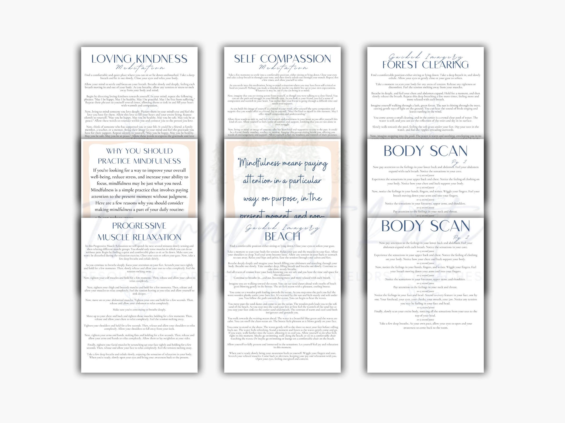 -11 scripts including body scan, progressive muscle relaxation, guided imageries, and meditations on acceptance, self compassion, gratitude, and loving kindness.