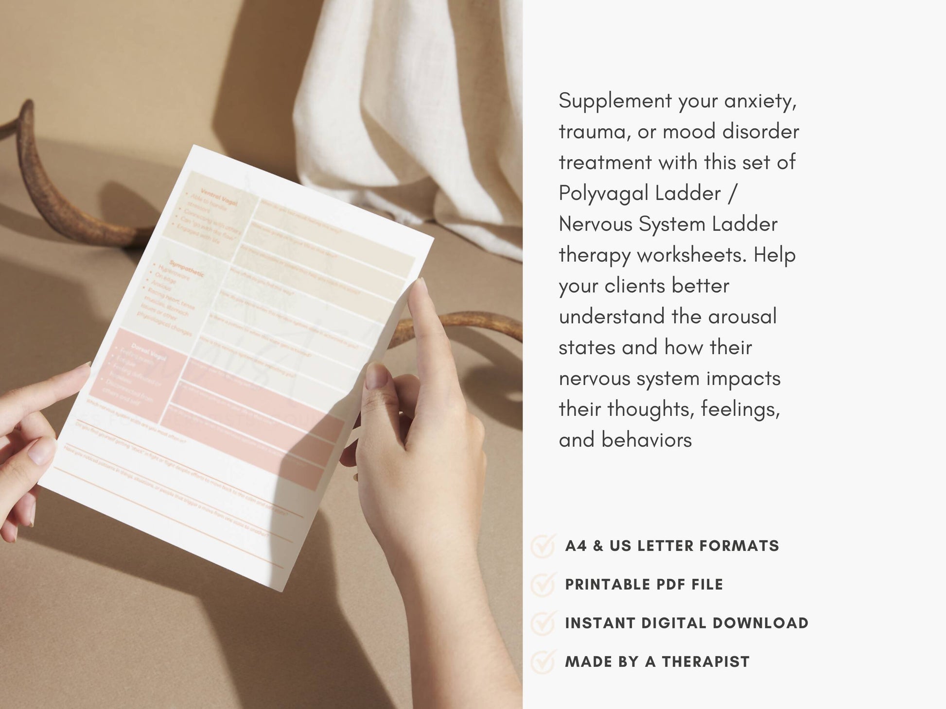 Supplement your anxiety, trauma, or mood disorder treatment with this set of Polyvagal Ladder / Nervous System Ladder therapy worksheets. Help your clients better understand the arousal states and how their nervous system impacts their thoughts, feelings, and behaviors. Perfect for