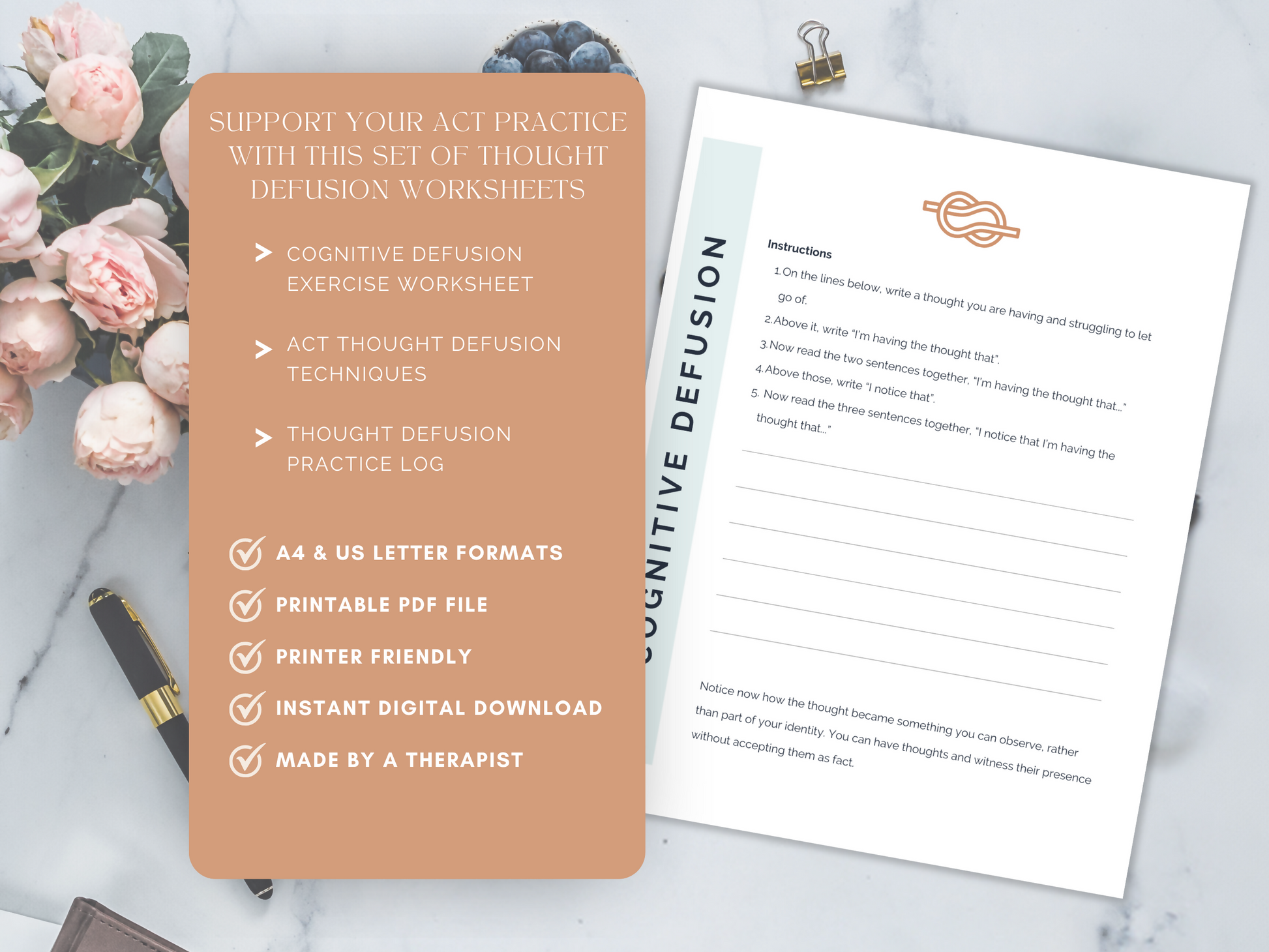 Support and enhance your Acceptance and Commitment Therapy practice with this Thought Defusion worksheet set. Great for those who struggle with overthinking or cognitive distortions. Can be used as part of your ACT practice or to support other therapeutic methods, such as CBT or Solution Focused.
